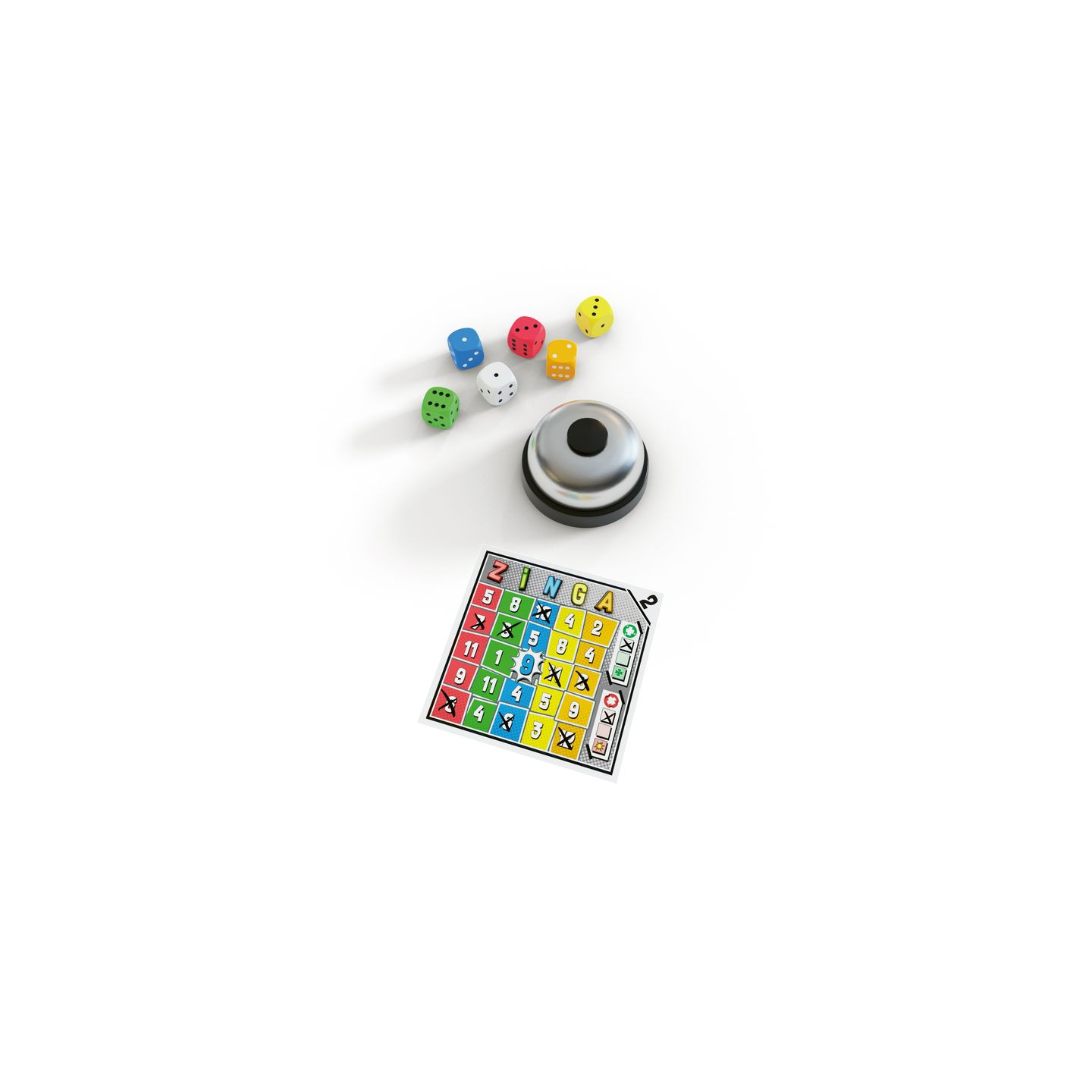 Zinga est un jeu basé sur l'observation et la rapidité. Au début de la partie chaque joueur dispose d'une grille de jeu (toutes différentes entre les joueurs) et d'un crayon. La sonnette et les dés sont placés au centre de la table.