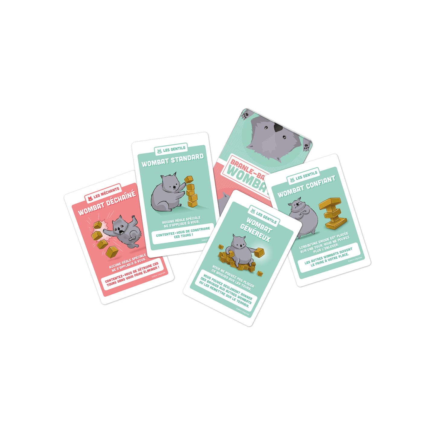 Matériel : 3 supports, 18 briques d'empilement, 10 cartes wombat, 6 cartes aide-mémoire, 1 carte de score, 2 marqueurs de points