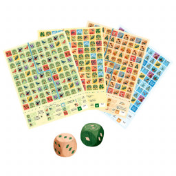 Matériel : 1 Bloc de 200 fiches recto-verso ( printemps, été, automne, hiver), 2 Dés, 1 Livre de règles.