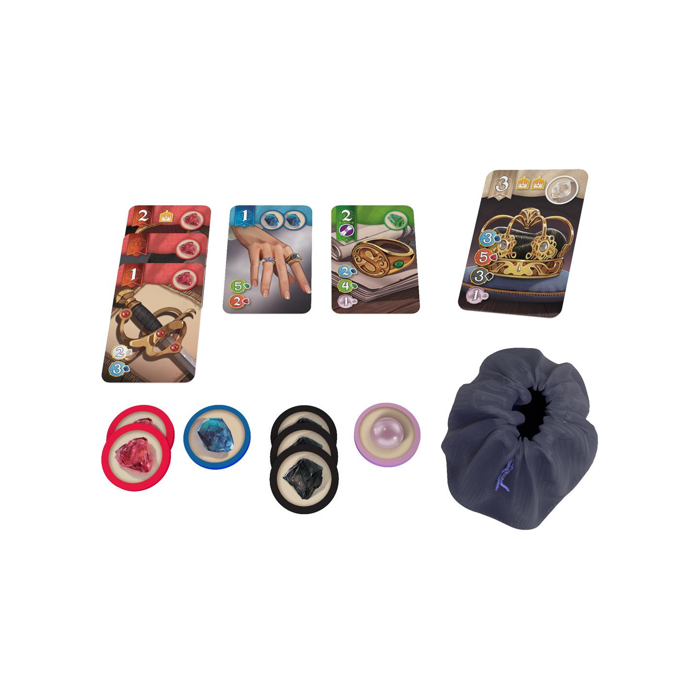 Matériel : 1 Tuile Victoire, 67 cartes Joaillerie, 1 sac, 3 figurines Privilège, 25 jetons, 1 plateau, 4 cartes Royales, la règle du jeu