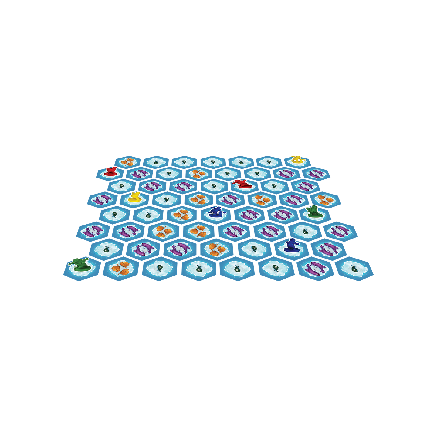 60 tuiles banquise (30 tuiles avec un poisson, 20 tuiles avec deux poissons, 10 tuiles avec trois poissons) 16 pingouins en plastique (4 par couleur)