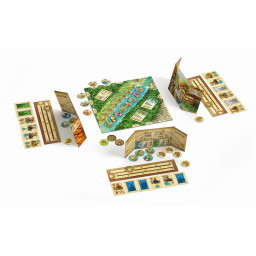 Matériel : 1 plateau de jeu, 61 jetons "marchandises", 12 jetons "empereur", 20 jetons "comptoir", 24 cartes spéciales, 4 planches score, 4 pièces à trou, 15 pièces valeur 50, 4 écrans, 1 sac en tissu, la règle de jeu.