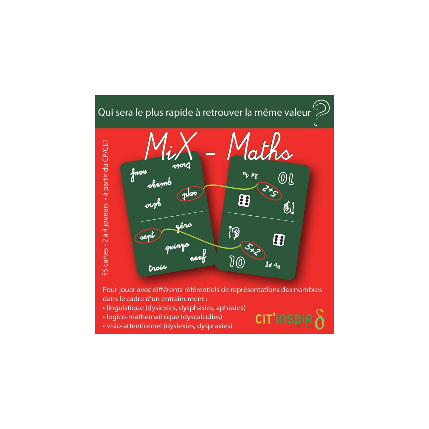 55 cartes : 21 cartes présentant les nombres en mots, 21 cartes présentant les nombres en images mathématiques, 4 cartes Super Numérix, cartes règles du jeux