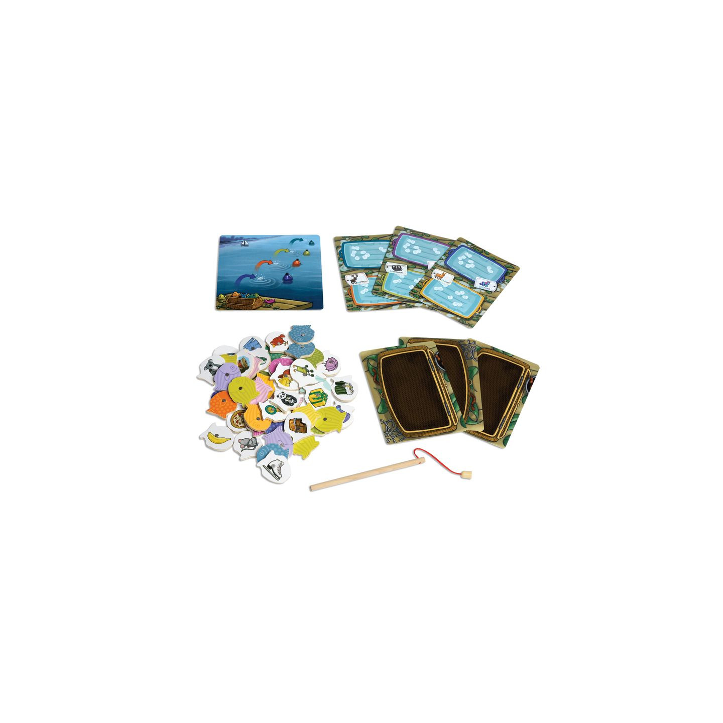 Matériel : 48 poissons en bois aimantés, 1 canne à pêche, 1 planche Cours d'Eau, 6 planches de jeu 'Paniers de Pêche" et Glacières, 1 Guide d'accompagnement, les règles des jeux