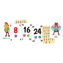 Le jeu MultiploDingo propose 10 règles différentes avec le même jeu de cartes. Ces règles permettent de travailler les multiplications, les divisions, les multiples et diviseurs, les carrés ainsi que les 4 opérations. Les cartes comprennent les nombres présents dans les tables de mulitplication jusqu'à 10. Les nombres rouges se multiplient entre eux pour donner les nombres noirs. Les couleurs des petits monstres sur les cartes permettent de vérifier si les multiplications sont correctes