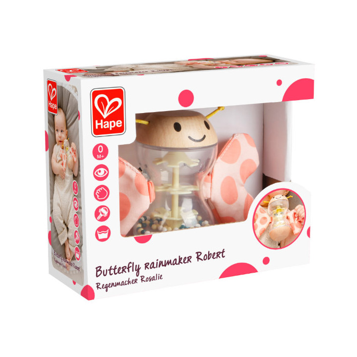 Avec sa jolie tête en bois, ce papillon offre aux bébés des heures de découverte. Le centre du jeu est composé d'un bâton de pluie. Les ailes en textile lessivables donnent la sensation du papier froissé lorsqu'on les prend en main. Ce jouet est facile à saisir. Votre enfant pourra ainsi le retourner, l'agiter, pour entendre les sons et observer les petites billes de couleurs bouger, en reproduisant le son de la pluie qui tombe.