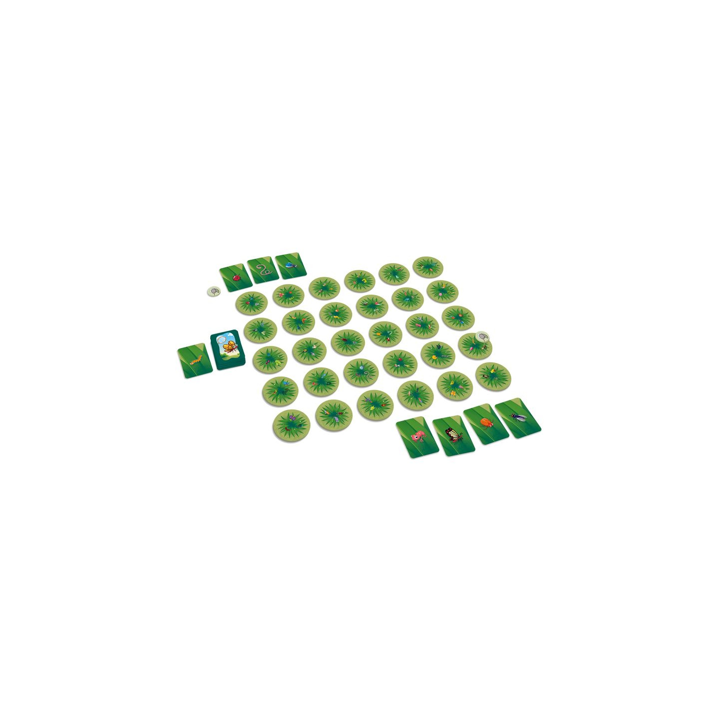 Dans Chasseurs en Herbe observez bien les insectes cachés dans l'herbe, retournez une carte et attrapez vite la bestiole correspondante à l'aide de votre jeton filet !